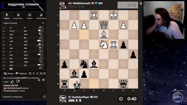 Друзья, всем привет. Подборка моих 9-ти партий со стримов. Шахматы. Блиц 3+0 на chess.com. Если интересно, - подписывайтесь на канал, ставьте лайки, оставляйте комментарии. Поддержка через: DonationAlerts: https://www.donationalerts.com/r/onedebutplayer Бусти: https://boosty.to/onedebutplayer/donate Donatepay: https://new.donatepay.ru/@1272445 Или на карту в телеграм-канале: https://t.me/onedebutplayer/3