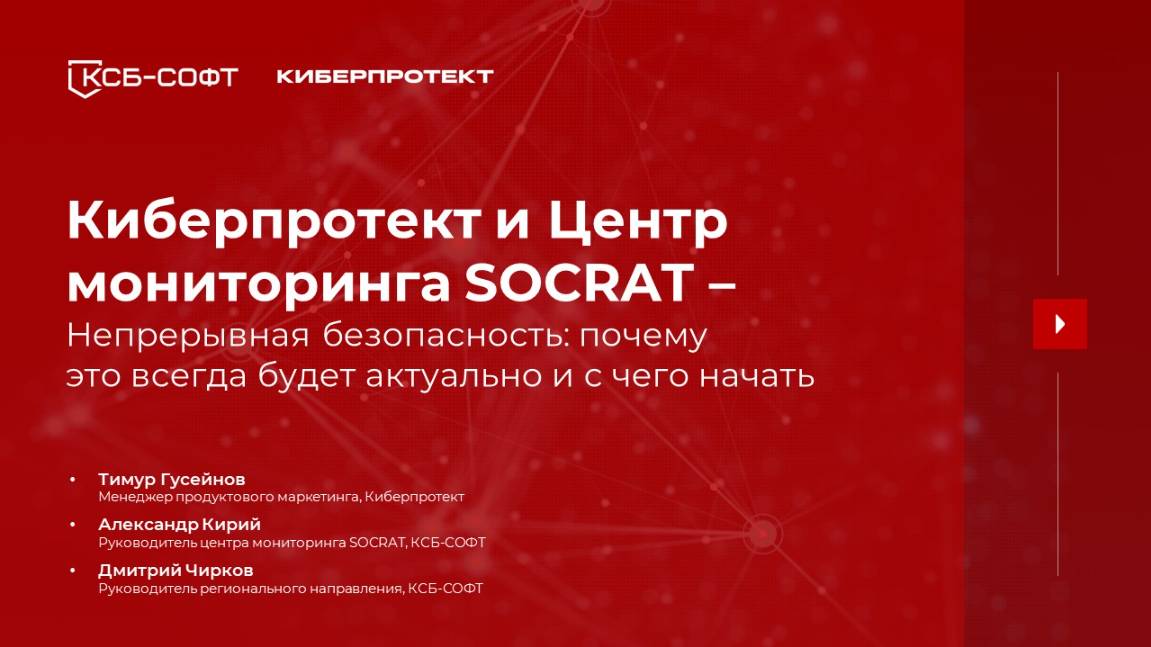 Полная конфиденциальность, минимальные риски, соответствие требованиям регуляторов — недостижимая мечта или разумная необходимость? Внедрение непрерывной безопасности делает процессы обработки информации более устойчивыми и управляемыми, а информационные ресурсы — защищёнными от большинства рисков. Об этом мы совместно с Киберпротект поговорили на вебинаре «Непрерывная безопасность: почему это всегда будет актуально и с чего начать». Ключевые вопросы: • С чего начинается непрерывная безопасность? • Организовать непрерывную безопасность самостоятельно или отдать на аутсорсинг? • Какие инструменты помогут правильно выстроить процесс непрерывной безопасности в организации? Спикеры вебинара: • Кирий Александр – руководитель центра мониторинга SOCRAT КСБ-СОФТ; • Чирков Дмитрий – руководитель регионального направления КСБ-СОФТ • Тимур Гусейнов – менеджер продуктового маркетинга, Киберпротект.