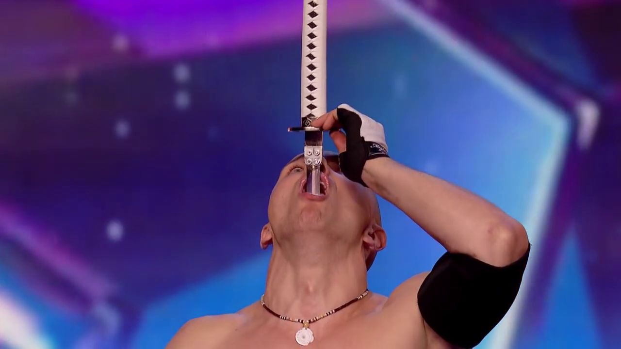 Шпагоглотатель Александр Магала на шоу Britain's Got Talent. Ранее он уже выступал на аналогичных проектах в России ("Минута славы"), Украине ("Україна має талант"), а также Италии, Франции и США.