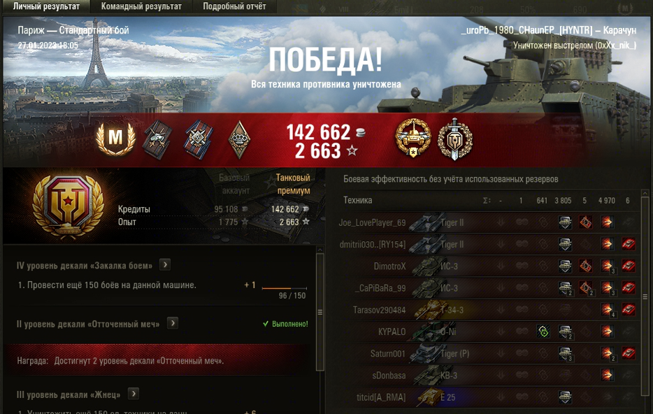 ПАРИЖ МАСТЕР на КАРАЧУН ОПЫТ: 1614 СУММАРНЫЙ УРОН: 5611 броней: 3805 медали: ВОИН и ОСНОВНОЙ КАЛИБР