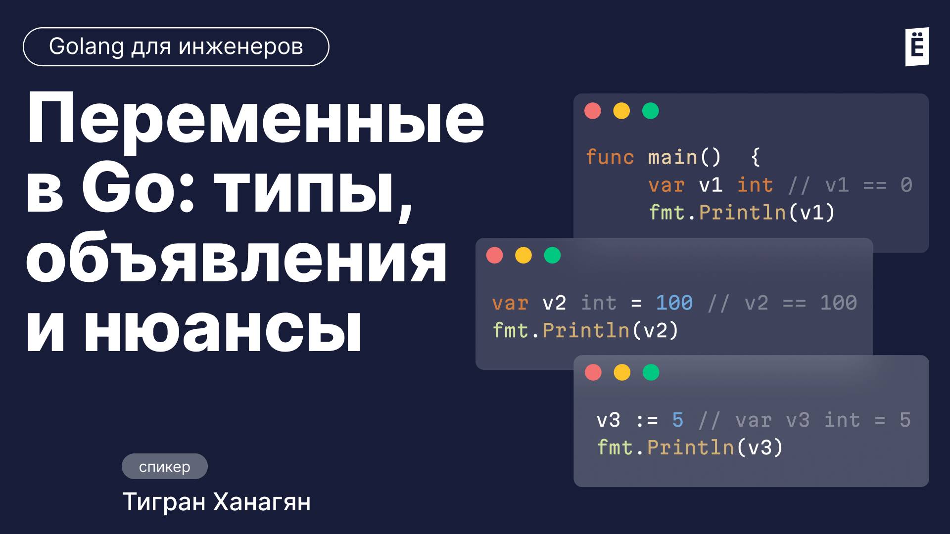 В этом видео разберем, зачем в Go нужны переменные, как их объявлять, присваивать и изменять значения, а также рассмотрим правила использования двух способов объявления: ключевого слова var и сокращенной формы := Рассказывает Тигран Ханагян, Senior software engineer в HungerStation DeliveryHero, спикер курса «Golang для инженеров». Больше о важных концепциях программирования в Go, взаимодействии с Docker и Kubernetes и разработке API-сервисов – на курсе «Golang для инженеров» https://to.slurm.io/1o4lOQ Старт 9 декабря.