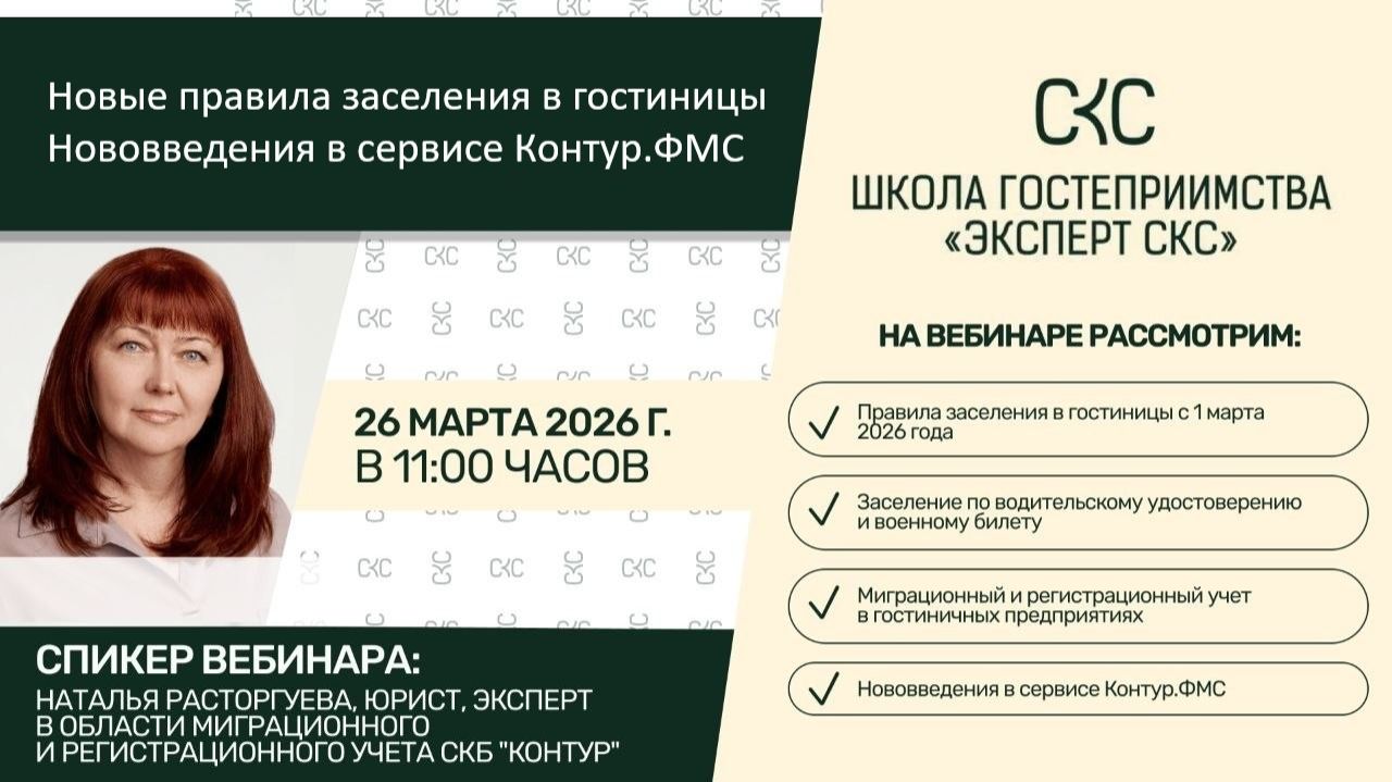ВЕБИНАР "Новые правила заселения в гостиницы. Нововведения в сервисе Контур.ФМС" 🔜СПИКЕР: Наталья Расторгуева, юрист, ведущий эксперт в области миграционного и регистрационного учета СКБ "Контур" На вебинаре рассмотрим: ✅Правила заселения в гостиницы с 1 марта 2026 года ✅Заселение по водительскому удостоверению и военному билету ✅Миграционный и регистрационный учет в гостиничных предприятиях ✅Нововведения в сервисе Контур.ФМС