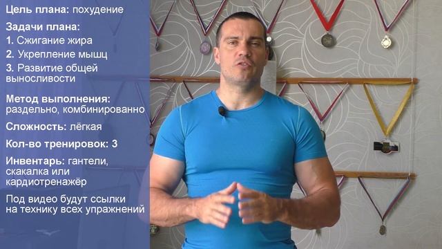 1 ТРЕНИРОВКА: Разминка 5-10 мин https://www.youtube.com/watch?v=AqpyR6vQvj0 1. Скакалка или кардиотренажёр 7 минут 2. Тяга гантелей в наклоне 3х15-20 https://www.youtube.com/watch?v=u7_af7jFb4g 3. Выпады с гантелями 3х15-20 https://www.youtube.com/watch?v=rX4UI71ySxE 4. Жим гантелей сидя 3х15-20 https://www.youtube.com/watch?v=jCA_CTIET80 5. Скакалка или кардиотренажёр 7 минут 6. Махи ногой, лёжа на боку 3х15-20 https://www.youtube.com/watch?v=7uMYFB08O4I 7. Подъём ног сидя на лавке 3х15-20 https://www.youtube.com/watch?v=FlCpfLOmUlo 8. Скакалка или кардиотренажёр 6 минут Заминка 2-5 мин https://www.youtube.com/watch?v=yM8WRIYeczA Подробнее про этот план: https://tvoytrener.com/www/tren_doma/nov_relief_3_po_d.html 2 Тренировка: https://www.youtube.com/watch?v=mD5r8Yfoq9w 3 Тренировка: https://www.youtube.com/watch?v=PDxFjTX5bAE Цель плана: похудение Задачи плана: 1. Сжигание жира 2. Укрепление мышц 3. Развитие общей выносливости Методы выполнения: раздельно, комбинированно Продолжительность: 1-2 месяца. Сложность: (лёгкая) Инвентарь: Гантели. Скакалка или кардиотренажёр. Эта программа подойдёт для полных новичков или для тех, у кого был длительный перерыв в тренировках. План не сложный. Он состоит всего из 5-ти упражнений и 3-х отрезков кардио по 6-7 минут. Вместе с разминкой и заминкой тренировки рассчитаны примерно на 1 час. Тренировки фулбади. То есть вы по немногу будете тренировать все группы мышц на каждой. Каждое упражнение вы будете делать по 15-20 повторений и по 3 подхода. Подходы, кстати, указаны возле каждого упражнения. Отдых между подходами примерно 2 минуты (в зависимости от сложности подхода). Подходы указаны только рабочие. То есть, без учёта разминочных. В качестве кардио можно использовать обычную скакалку. Но если у кого-то есть домашний кардиотренажёр (эллипс, вело или дорожка), то это будет даже лучше. Если у вас совсем нет никакого кардиоинвентаря, то подойдёт обычный бег, или подъём и спуск по лестнице многоквартирного дома. Работать на кардио надо так, чтобы ваш средний пульс был примерно 110 – 130 ударов в минуту. Веса берите такие, что вы могли сделать указанное количество повторений и оставался запас на 2 – 4 повторения. Потом со временем запас надо убирать. Оптимальные дни тренировок – через день. Например: ПН, СР, ПТ. Или: ВТ, ЧТ, СБ. Как освоитесь к этой программе – можно переходить на планы потяжелее. Например, где есть суперсеты и больше упражнений. Или можете в этом плане изменить сложность, нажав на вкладку «Настройки плана». Начать можно с 12-15 повторений, постепенно увеличивая их до 20. Удачи!