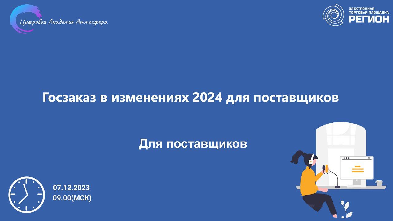 Подписывайтесь на нас в социальных сетях, чтобы не пропустить свежие новости: https://academy-atmosphere.ru/zakupki https://t.me/academy_atmosfera https://vk.com/academy_atmosfera https://rutube.ru/channel/24606397/ 00:00 Вступление 00:59 Приветствие спикера Губайдуллину Асылъяр Ильдусовну 01:24 Госзаказ в изменениях 2024 для поставщиков 02:22 Федеральный закон от 27.11.2023 № 555-ФЗ 03:10 Приказ Минпромторга России от 25.10.2023 № 4044 04:15 Новое по авансовым платежам. Федеральный закон от 27.11.2023 № 540-ФЗ. (Закон о бюджете) 05:32 Какие изменения начинают действовать с января 2024 года? 10:19 Статья 4. Редакция от 14.11.2023 10:59 Статья 34 часть 15. Редакция от 02.11.2023 13:23 Постановление Правительства РФ от 16.05.2023 N 753 16:12 Постановление Правительства РФ от 02.09.2023 N 1443 16:49 Что изменится в марте? 18:18 Что изменится в апреле? 22:48 Что изменится в июле? 24:09 Статья 15 часть 15. Редакция от 14.11.2023 24:50 Изменение пункта 2 части 1 статьи 93 26:17 Совсем новое в 93 ст 27:52 Совсем новое в 95 ст 28:22 На стадии проекта 31:43 Проект постановления Правительства РФ ID проекта 01/01/1123/00143808 33:50 Проект ID проекта 01/02/11-23/00143911 36:14 Продление антикризисных мер 36:22 Проект Федерального закона N 475970-8 38:56 Ответы на вопросы участников