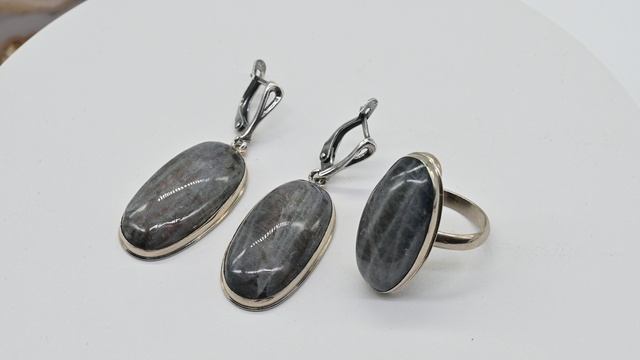 •Авторское украшение ручной работы. Камни установлены в оправу из ювелирного сплава - нейзильбер. •Форма и рисунок камня никогда не повторяются, что делает данное изделие единственным в своем роде. •Габарит кольца 15*28мм, серьги: 17*31мм., вес 11,8 г •Указаны габариты серьги без швензы. •Кабошоны наклеены на основу из долерита, поэтому с тыльной стороны имеют другой вид. •На поверхности камня допустимо присутствие естественных природных прожилок и микротрещин.