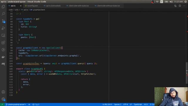 Code: https://github.com/rosesonfire/understand-quran Apollo GQL Server setup: (0:00) Into to Terminator: (2:20) Run Apollo server: (3:20) Rant about constructing honorable PRs: (5:30) NodemonPlugin for Webpack: (7:55) GraphQL playground: (9:33) WTF is scalar Upload??: (10:10) Rant about blob/file upload: (11:20) Scalars in GQL: (15:35) Apollo GQL Client setup: (18:25) Integrating Apollo GQL Client with NextJS: (26:04) Running optimized NextJS pages in production mode: (40:05)