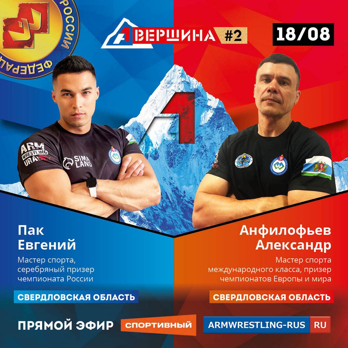 «Вершина» - это ежемесячный турнир для членов сборной команды России. Каждый месяц в Москве, Екатеринбурге, Казани будет организована серия из пяти армфайтов, с участием лучших российских рукоборцев - членов сборной команды России. Пять пар, одна из которых - члены сборной по пара-армрестлингу. Пять раундов. Турнир можно было посмотреть в прямом эфире на канале «Спортивный» Триколор ТВ.