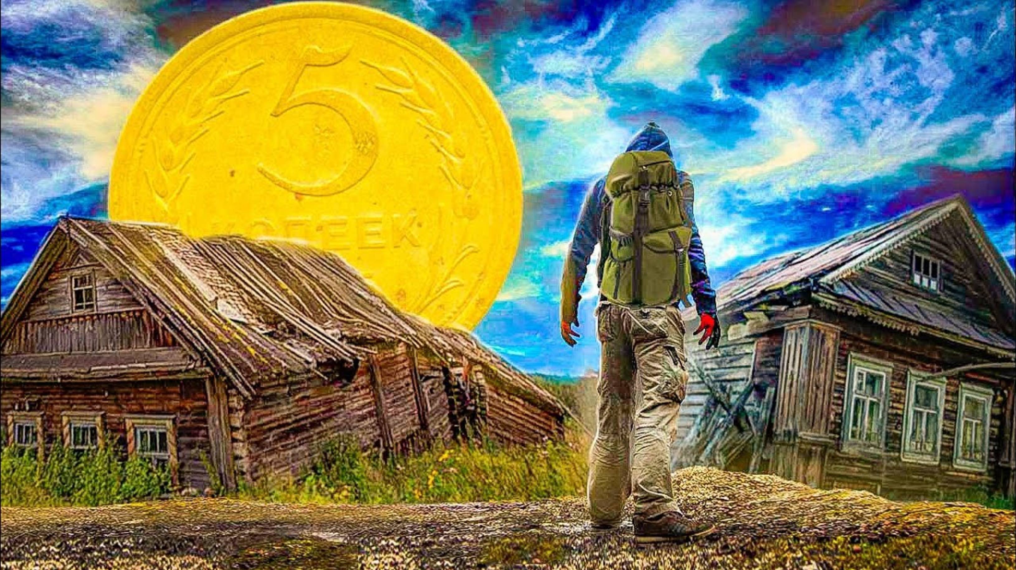 Нашли монету в траве/много заброшенных домов...