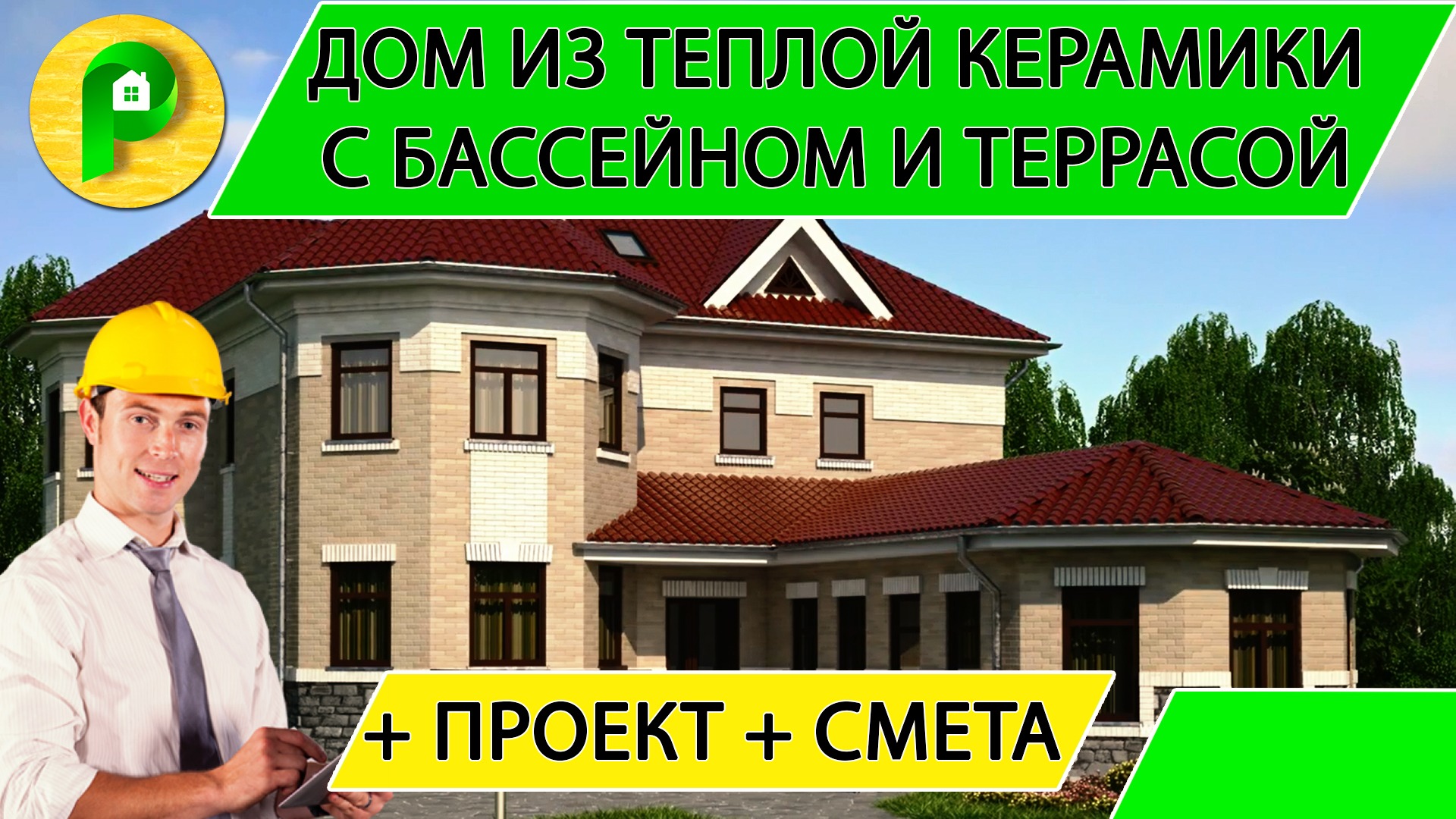 Проект двухэтажного дома с бассейном, террасой и эркером из теплой керамики Ремстройсервис М – 148