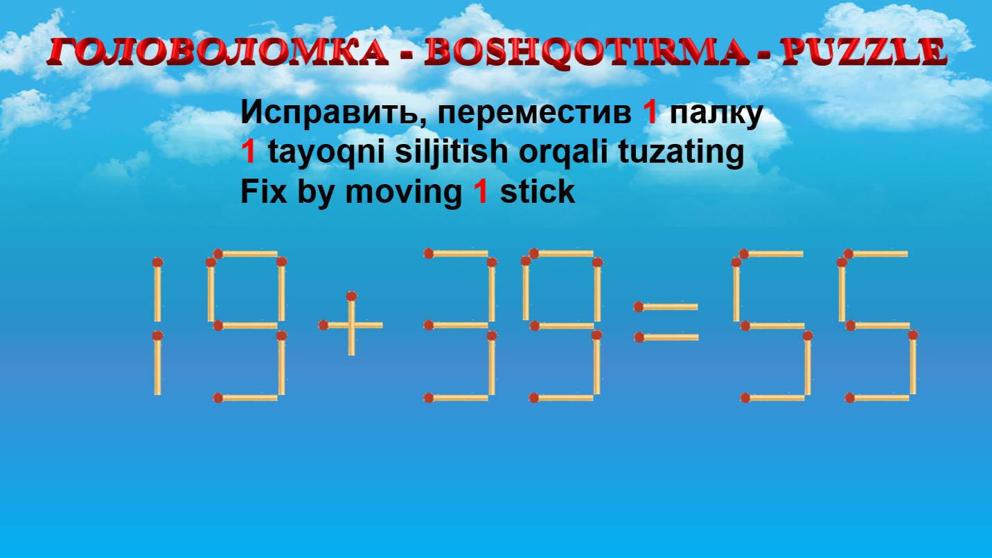 ГОЛОВОЛОМКА - BOSHQOTIRMA – PUZZLE. Спичка. 19+39=55, 15+69=90, 19+38=58, 18+25=42