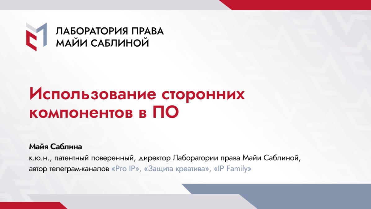 Содержание лекции 1 часть. Такой разный Open Source — такой разный Open Source — общие права и обязанности, предусмотренные Open Source лицензиями — плюсы и минусы использования Open Source — виды Open Source лицензий — организация по регулированию открытого программного обеспечения — принципы Open Source лицензий — понятие и принципы «свободного» программного обеспечения — дополнительное соглашение к Open Source лицензиям — CLA — «другой» Open Source — соотношение понятий Open Source и открытых лицензий в ГК РФ — практические аспекты использования Open Source лицензий — совместимость лицензий — Open Source лицензии и коммерция 2 часть. «Картинки». Шрифты. Мультимедийное ПО — принципы Creative Commons — требование лицензий Creative Commons — особенности лицензий Creative Commons — структура лицензий Creative Commons — шесть стандартных лицензий Creative Commons — использование в России лицензий Creative Commons — шрифты и способы их охраны — типовые лицензии на шрифты — условия оплаты лицензий на шрифты — неочевидные нюансы использования шрифтов — подборка судебных дел — практические рекомендации по выбору лицензий — мультимедийное программное обеспечение 3 часть. Искусственный интеллект — понятие искусственного интеллекта — схема работы искусственного интеллекта (LLM) — охраноспособность результатов работы искусственного интеллекта и авторские права на такие результаты — использование искусственного интеллекта при разработке ПО (Сбер Kandinski 3.1, Midjourney, Mintlify, OpenAI Chat GPT, GitHub, Copilot, Anthropic (Claude Sonnet 4/5) — некоторые очевидные вопросы использования искусственного интеллекта — инструменты ИИ для решения практических задач разработки программного обеспечения — плюсы и минусы использования искусственного интеллекта в разработке ПО — рекомендации по использованию искусственного интеллекта при разработке ПО Меня зовут Майя Саблина Я кандидат юридических наук, патентный поверенный и руководитель Лаборатории права Майи Саблиной. Здесь рассказываю про интеллектуальную собственность простым языком 💡 🔹 Как с нами связаться: msablina.ru +7 (995) 787-95-77 info@msablina.ru 🔹 Телеграм-каналы Майи Саблиной: Pro IP – https://t.me/ipmir Защита креатива – https://t.me/ipprotection IP Family – https://t.me/ipfamily 🔹 Мы в других соцсетях: Подкаст – https://mayaproip.mave.digital/ RUTUBE – https://rutube.ru/channel/40283977/ YouTube – @mslawlab TenChat – https://tenchat.ru/maya_sablina #IP #защитакреатива #бренд #логотип #товарныйзнак #патент #авторскоеправо #бизнес #интеллектуальнаясобственность #МайяСаблина #пзпо #курс #вебинар