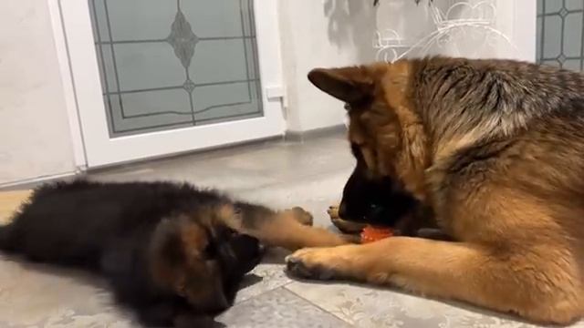 Немецкая овчарка защищает свой мяч от щенка немецкой овчарки - 2023 год