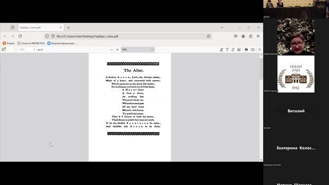27 сентября 2024 г. в рамках XXX Международной научной конференции «Шекспировские чтения 2024» в Институте мировой литературы им. А. М. Горького РАН состоялась секция «Шекспир и литература XVI-XVIII вв.». 2:11 Л. В. Дорофеева (СахГУ, Южно-Сахалинск) Забвение как ценности: Макбет и другие 18:33 Н. С. Зелезинская (БГУ, Минск, Беларусь) Хроматический код трагедии Дж. Уэбстера «Белый дьявол» в контекстах эпохи 49:08 Л. Д. Давыденко (ПСТГУ, Москва) «Война театров»: жанровое прочтение 1:08:50 А. М. Масальцева (МГУ им. М. В. Ломоносова, Москва) Ускользающая маска: аутсайдер шекспировской комедии как трагикомический персонаж 1:46:15 А. Г. Волкова (независимый исследователь, Калуга) Литургический контекст английской поэзии начала XVII в.: «Храм» Дж. Герберта 2:03:56 Н. Д. Мамедханова (БСУ, Баку, Азербайджан) Восприятие любви в поэзии Возрождения («Сонеты» У. Шекспира и «Лепестки роз» А. Аррани) 2:13:47 А. В. Титова (РГУ им. С. А. Есенина, Рязань) Влияние личности и творчества Шекспира на развитие английского либертинизма 2:38:08 И. И. Лисович (РАНХиГС, Москва) «Макбет» У. Шекспира: истоки и принципы магического 3:07:17 О. Ю. Поляков (ВятГУ, Киров) Классицистическая рецепция Шекспира в Англии начала XVIII в.: акценты Джона Денниса 3:28:08 П. Д. Зуева (МГУ, Москва) Типическое и индивидуальное: С. Джонсон и С. Т. Колридж о шекспировских характерах #Шекспир #ШекспировскиеЧтения #Shakespeare #ShakespeareReadings