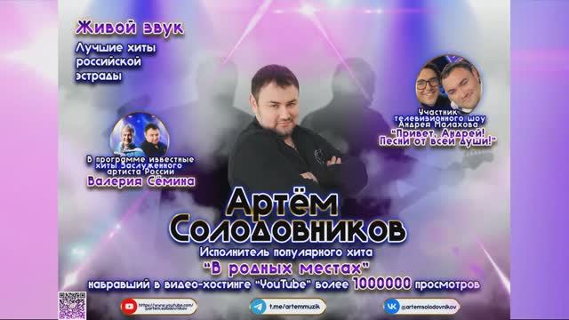 Артем Солодовников - выдающийся деятель, пропагандист эстрадных и народных песен. Вокалист, объединяющий профессионалов и любителей - музыкантов разных национальностей и культур, композитор, аранжировщик. Преданность эстрадному искусству, безграничная любовь к песням, национальным инструментам. Буду благодарен за посильную материальную поддержку на развитие канала YouTube, на запись и выпуск новых песен и видеоклипов. Карта сбербанка: 2202 2001 4727 6206 Анастасия Николаевна Т. Подпишись, чтобы не пропустить !!! ??? ??? ??? Телеграмм : https://t.me/artemmuzik В контакте : https://vk.com/artemsolodovnikov Одноклассники : https://ok.ru/profile/568293485004
