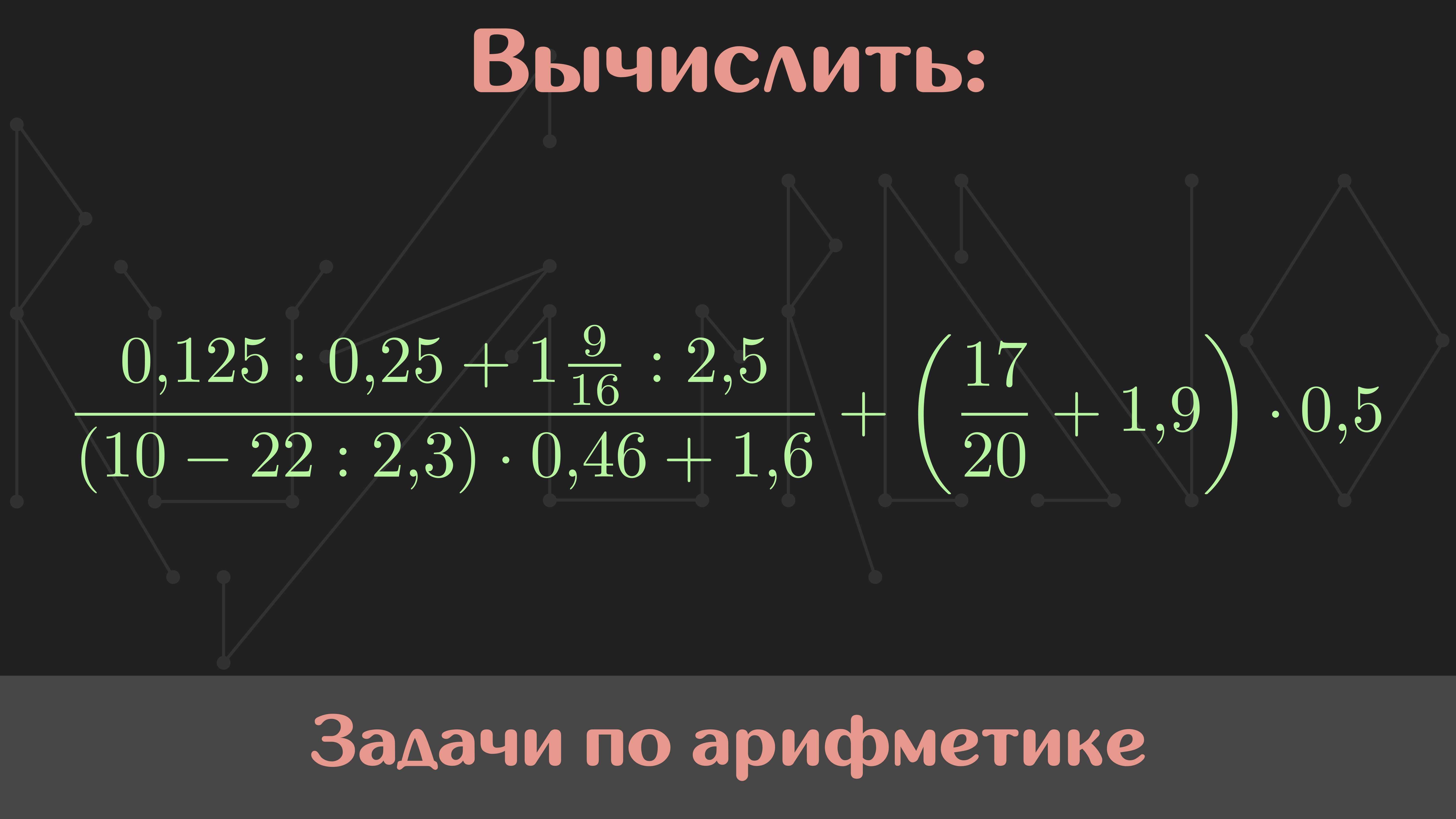 Мой курс по арифметике: https://stepik.org/a/195543 Условие: Вычислить (0.125 : 0.25 + 1[9/16] : 2.5) / ((10 - 22 : 2.3) * 0.46 + 1.6) + (17/20 + 1.9) * 0.5 Памятка: перед просмотром решения задания обязательно попробуйте решить задачу самостоятельно. Так вы научитесь вырабатывать собственный подход к решению. Музыка: Nomyn — Moonlight #Сканави #Арифметика #РешайСоМной #Математика