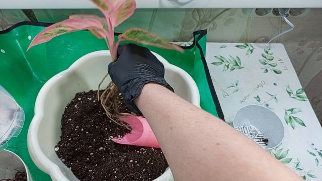 Пересаживаю свою Аглоанему в свежий грунт и отделяю детку.