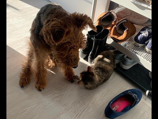 Вельштерьер-Хеппи в 13 лет стала нянькой маленькому котёнку. 2021.