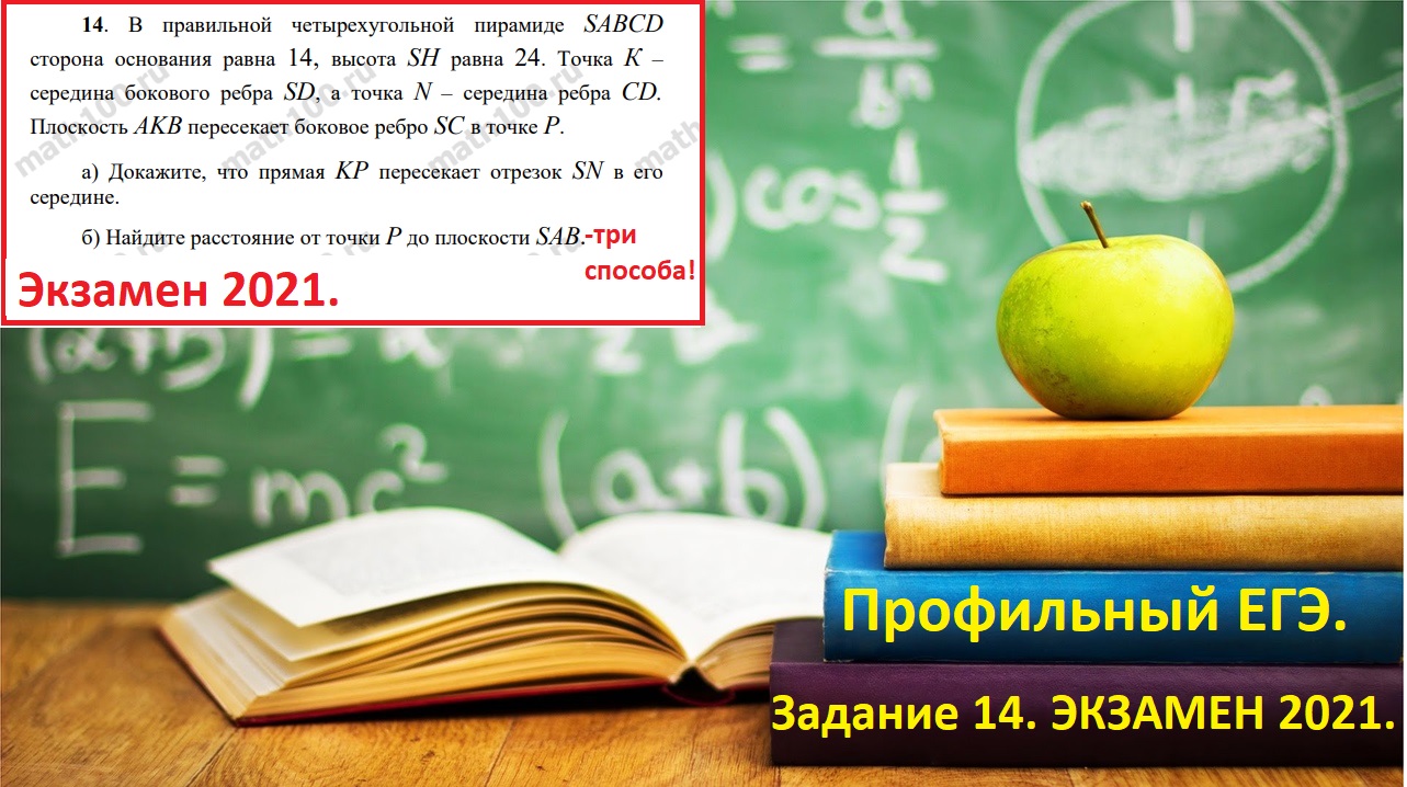 В правильной четырехугольной пирамиде SABCD сторона основания AD = 14, высота SH = 24. Точка K — середина бокового ребра SD, а точка N — середина ребра CD. Плоскость ABK пересекает боковое ребро SC в точке P. а) Докажите, что прямая KP пересекает отрезок SN в его середине. б) Найдите расстояние от точки P до плоскости ABS. ПОДПИШИСЬ: 1. Запасной канал: https://rutube.ru/channel/24546520/vi... 2. Группа: https://vk.com/math_for_dummies #Задание13Стереометрия #Реальныйэкзамен2021 #ПрофильныйЕГЭЗадание13 #Профиль2021 #Реальныйэкзаменпрофиль2021 #ПрофильРасстояниеотточкидоплоскости