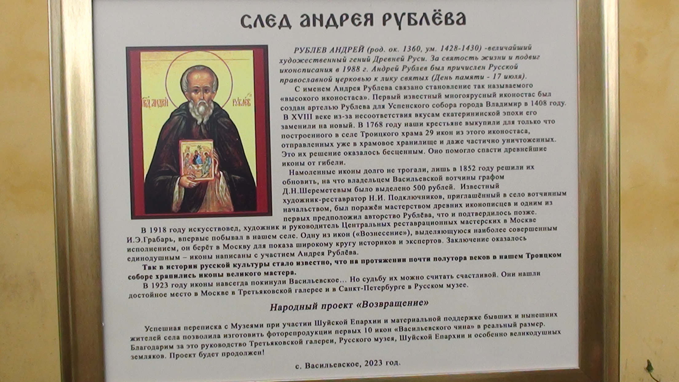 Народный проект в селе Васильевское "Андрей Рублёв возвращается". Васильевское — одно из древнейших сел области, еще в 1554 году бывшее в дворцовом владении. Располагавшееся на правом берегу речки Матня, при пересечении дорог из Шуи на Дунилово, Кинешму и Гороховец, имело важной торговое значение. По преданию, в период Смутного времени здесь образовалась усадьба для царской соколиной охоты царя Всея Руси Василия Шуйского. Бывая в Васильевском на охоте, государь любил здесь пышно отобедать. К началу 19 века Васильевское находилось во владении Н.П. Шереметева. При графах Шереметевых село стало торговым и процветающим. А где торговля и ремесло – там и достаток. Оно поражало современников благоустроенностью: мощеными улицами шириной от 30 до 60 саженей и добротной застройкой. В селе, известном к этому времени ежегодными ярмарками, проводившимися на Троицу, и еженедельными базарами, расширяется каменное строительство. Одновременно с развитием торговли в селе возрастает роль промыслов и мануфактур. Например, был весьма развит ткацкий промысел. Жители села Васильевское Шуйского района восстанавливают старинный уникальный иконостас работы Андрея Рублева "со товарищи" – первые 10 икон-фотокопий уже возвращены на родную землю и установлены в главном храме села – храме Троицы Живоначальной. Об этом во время экскурсии рассказала жительница села Васильевское Ирина Николаевна Аверина, председатель совета ветеранов села, краевед, член Общественной Палаты Ивановской области – один из организаторов проекта "Возвращение Андрея Рублева. 100 лет спустя". "Иконостас работы Андрея Рублева "со товарищи" был приобретен на деньги, собранные крестьянами села Васильевское и находился в нашем храме 150 лет, а в 1923 году был вывезен и передан на хранение и реставрацию в Третьяковскую галерею и Русский музей – всего 27 икон. Год назад мы, активные жители села, и представители Шуйской епархии писали письма в эти музеи с просьбой выслать нам цифровые изображения икон, написанных Андреем Рублевым и его последователями. В итоге нам удалось получить фотографии части икон", − рассказала собеседница. На средства, собранные селянами, удалось изготовить и установить в иконостас храма первые десять фотокопий огромных икон, 3 х1 метр каждая. Именно их торжественно презентовали широкой публике в субботу, 20 мая. В селе в честь такого события состоялась экскурсия по историческому центру для гостей, затем презентация проекта "Возвращение" и концерт камерного хора духовной музыки под руководством Евгения Боброва в Троицком храме. "У нас осталось еще шесть изображений, их мы также планируем позднее напечатать и установить в иконостас. Для этого вновь понадобится сбор средств. Но мы считаем, что начало положено, и большая ценность, что основная часть уникального иконостаса вернулась на родину", − отметила Ирина Аверина. Мероприятие частным образом посетил губернатор Ивановской области Станислав Воскресенский. Согласно исторической справке, древний обветшалый иконостас Успенского собора города Владимира, состоящий из икон начала XV в. кисти Андрея Рублева, Даниила Черного и других иконописцев их круга, был списан в храмовое хранилище. В 1768 г. иконостас, состоящий из 29 икон, купили жители села Васильевского. Он был установлен в Свято-Троицкой церкви. Сразу после революц