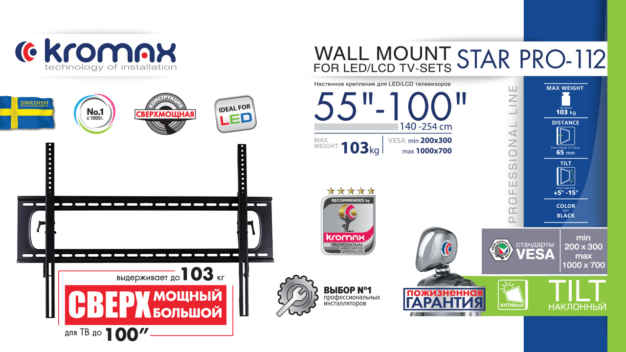 KROMAX STAR PRO-112 BLACK надёжно удержит экран размером 55"-100" дюйма и весом 103 кг. Простая конструкция KROMAX STAR PRO-112 BLACK идеально подойдет для самостоятельного монтажа. Наклонная конструкция регулировать экран вверх и вниз на +5 -15°. Кронштейн подходит для большинства телевизоров популярных брендов, таких как Samsung, LG, Sony, Panasonic, Sharp, Toshiba, KIVI, Xiaomi Mi, SUPRA, Hyundai, Erisson, Horizont, JVC, Thomson, HAIER, BBK, Витязь, Веко, BQ, OZON, SkyLine, Pioneer, Philips, Rolsen, Harper, Hisense, Hitachi, Polarline, Prestigio и других. Крепёжные отверстия KROMAX STAR PRO-112 BLACK изготовлены по стандарту VESA. В комплектацию KROMAX STAR PRO-112 BLACK входят необходимые для монтажа материалы. Вся продукция обеспечивается гарантийными обязательствами. Пожизненная гарантия на все сварные и механические соединения позволит наслаждаться конструкцией долгий срок. Во время эксплуатации KROMAX STAR PRO-112 BLACK демонстрирует поразительную износостойкость и безотказность. Подробнее https://www.kromax.ru/produce/tilt_frame/4862/