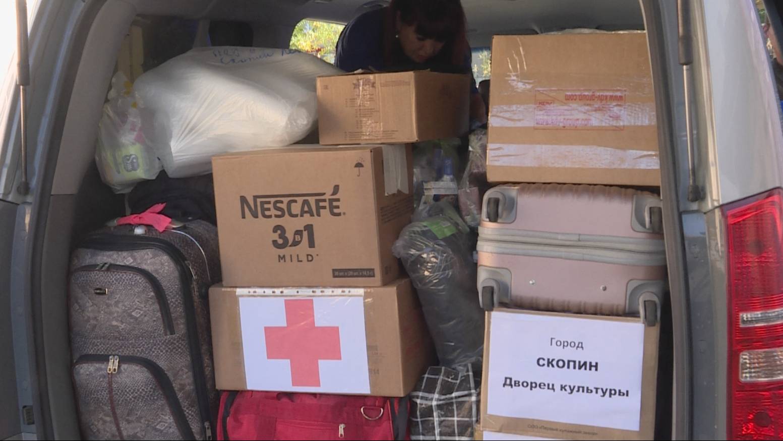 Четверо рязанских волонтёров загружают багажник автомобиля продуктами питания и средствами ухода за больными. Они отправляются в Луганский военный госпиталь, чтобы помогать российским бойцам.