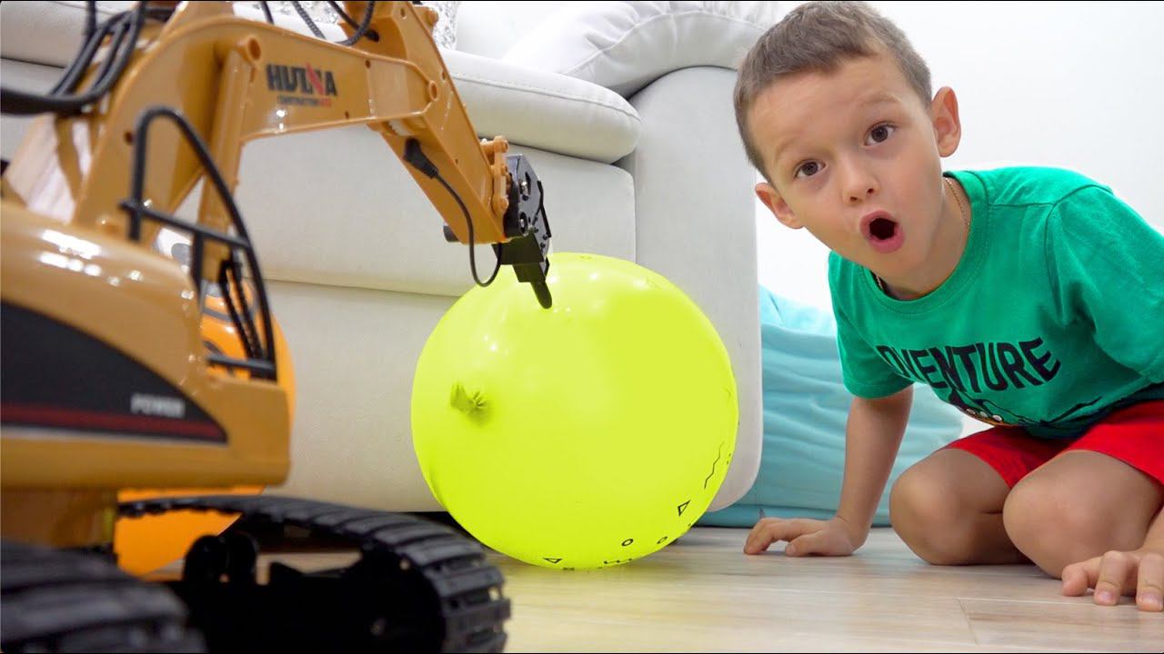 София и Макс играют с игрушечным трактором экскаватором и воздушными шарами