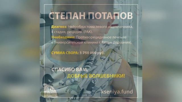 3-летний Стёпа с апреля 2020 года отчаянно пытается победить РАК. Прошёл сложнейшее лечение – множество блоков химии, операцию по удалению опухоли, трансплантацию костного мозга, иммунотерапию и протонную терапию. Вышел в ремиссию, но через два месяца страшная болезнь вернулась. В Университетской клинике Кёльна уже подобрали для мальчика самое прогрессивное и эффективное противорецидивное лечение. Терапию уже нужно начинать, иначе Степан не выживет. ⠀ Степан Потапов, 3 года. Диагноз: Нейробластома левого надпочечника, 4 стадия, рецидив (РАК). Необходимо: Противорецидивное лечение в Университетской клинике г. Кёльн (Германия). ⠀ Сейчас Стёпа проходит обследования в Германии. Врачи готовы незамедлительно начать его лечение. После иммунотерапии случился ранний рецидив, поэтому для мальчика подобрали другую схему –таргетную терапию в комбинации с химией, которая успешно применяется в США детскими онкологами и показывает очень хороший результат. ⠀ Стёпочка мучается от страшных болей – РАК вернулся опухолью в грудной клетке. Малыш страдает, не спит ночами и часто плачет. Лечение нужно срочно начинать. Иногда боль отпускает Стёпу. В такие моменты мальчик вспоминает о том, что скоро Новый год, и он обязательно должен подготовиться к приходу Деда Мороза. Говорит, что очень хочет его увидеть и попросить его помочь ему, чтобы он больше никогда не болел. ⠀ ПОМОГИТЕ СТЁПЕ ПОБЕДИТЬ РАК СБОР ЗАКРЫТ! СПАСИБО ЗА ПОМОЩЬ.
