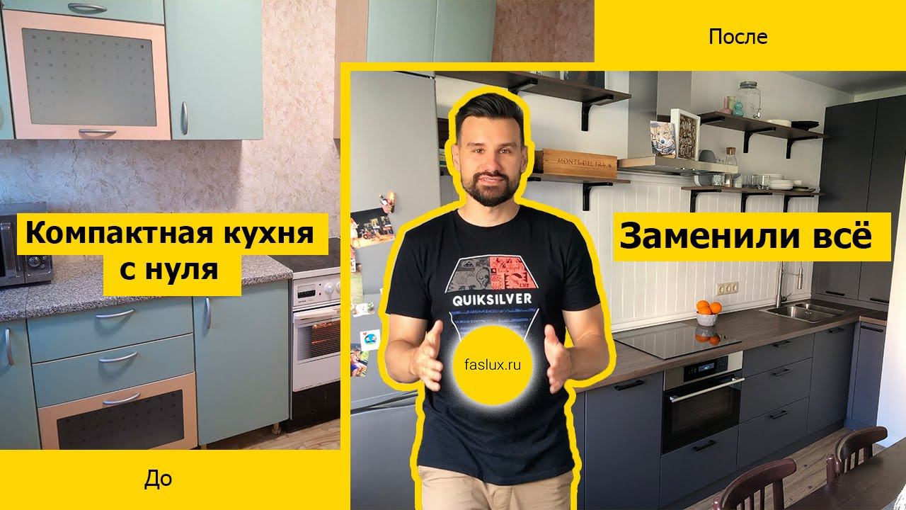 Компактная кухня с нуля. Замена фасадов, столешницы, корпусов и фурнитуры.