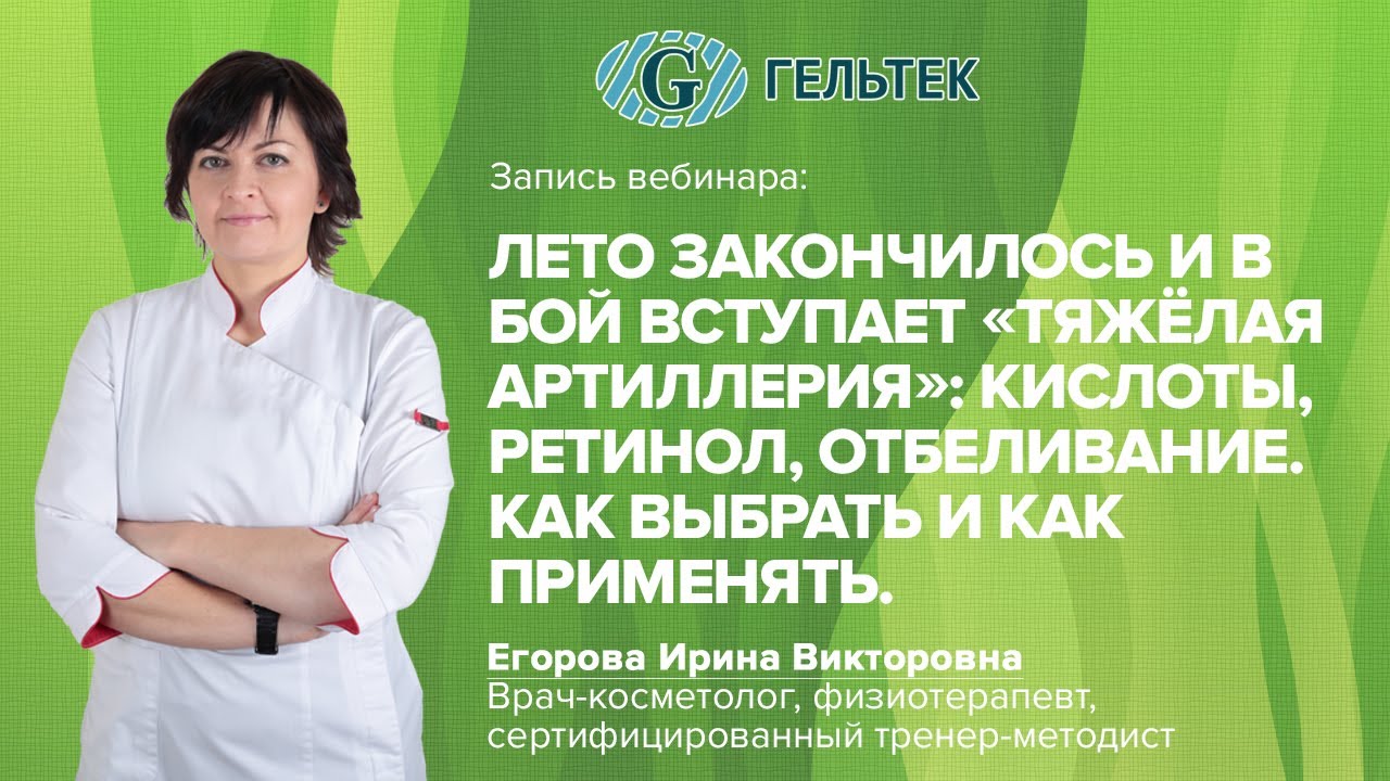 В данном вебинаре мы поговорим об основных целях и задачах ухода за кожей в осенне-зимний период. О том, какими средствами достигается решение проблем пигментации, проявлений фотостарения, гиперкератоза и других последствий "ультрафиолетовой агрессии". Обсудим нюансы и правила безопасного применения сильнодействующих и агрессивных косметических ингредиентов в домашней рутине. Вы узнаете, как оптимально сочетать кислоты, ретинол, как избежать побочных эффектов и грамотно применять профессиональную косметику с активными компонентами. Эксперт: врач-косметолог, физиотерапевт, сертифицированный тренер-методист компании «Гельтек-Медика» Егорова Ирина Викторовна. НОВИНКИ! __________________________________________ Крем-сыворотка Retiderm 0.25: https://is.gd/qTgRfo Антицеллюлитный гель Thermo-Intensive: https://is.gd/kBfk3W Сыворотка ProbioSkin: https://is.gd/jgaPm4 Очищающий мусс с Aloe Vera: https://is.gd/x42Rs0 Крем-сыворотка для век с эффектом лифтинга: https://is.gd/1D0BRl Антиоксидантный коктейль «VitaMatrix»: https://is.gd/5KSU1W ______________________________________________________ ВЕБИНАРЫ и СЕМИНАРЫ // Полезная литература https://geltek-medica.ru/cosmetics/education/ ______________________________________________________ #кислотыдлялица #ретиноликислоты #отбеливаниелица