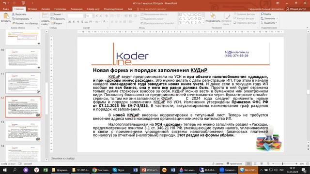 Компания «Кодерлайн» провела вебинар «УСН за 1 квартал 2024 на примере 1С:ERP» Ведущая: Гардышева Галина - консультант-аналитик 1С:ERP Целевая аудитория для бухгалтеров, пользователей и специалистов ИТ-подразделений компаний различных отраслей. Описание УСН всегда считалась «облегченным» режимом, по сравнению с ОСНО. Но так ли сейчас обстоит дело с Упрощенкой? На примере 1С:ERP смотрим, какие изменения произошли с этим спец. режимом в 2024 году. Программа 1. Новые правила составления КУДиР по УСН; 2. Когда компания (ИП) слетает с упрощенки; 3. Новый сервис Министерства по налогам и сборам в личном кабинете плательщика; 4. Сложности «простой» упрощенки; 5. Дополнительные сервисы, отчеты.