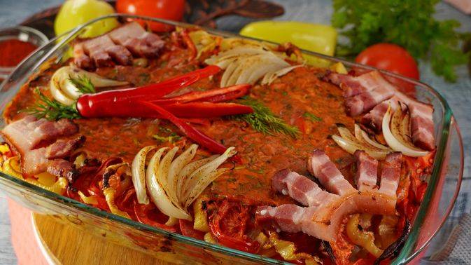 Сочная рыба с гарниром. КАРП, ЗАПЕЧЕННЫЙ С ГРУДИНКОЙ И ОВОЩАМИ