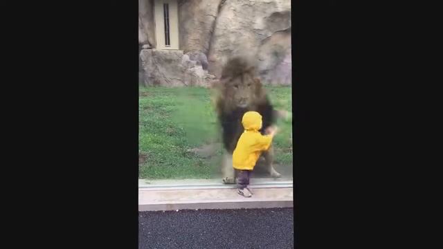Япония, лев пытается съесть ребенка в зоопарке через стекло.