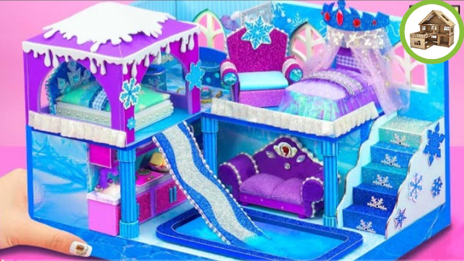 Замороженный мириатюрный двух комнатный замок водной горкой и ледяным бассейном из картона /206