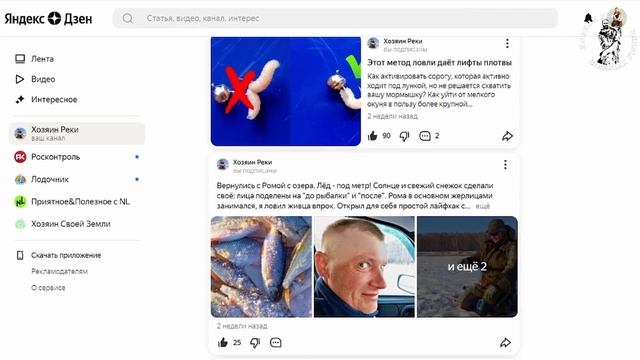 Мой канал с короткими и полнометражными видео, статьями о рыбалке и актуальными постами https://zen.yandex.ru/hozyain Интересные видео Метровая щука подо льдом https://zen.yandex.ru/video/watch/5feb41f5e08bb3522f0ab1a3 Выставил вторую плавающую жерлицу и увидел быстро плывущий первый флажок https://zen.yandex.ru/video/watch/60b42fa33204ed610276a3bc Обработка мотыля, делающая рыбалку на мормышку удобнее https://zen.yandex.ru/video/watch/62300d4b8ea4b07e2578b2d9 Легко лишаем жерлицу перехлёстов через стойку катушки https://zen.yandex.ru/video/watch/5ffa5a74fe4e686f6a52f934 Актуальные статьи Выбор "плетёнки" для спиннига https://zen.yandex.ru/media/hozyain/vybor-pletenki-dlia-spinninga-delius-13letnim-opytom-5f8d92a5056ea051cac1e251 Универсальный приём, позволяющий ловить на донки в разы больше https://zen.yandex.ru/media/hozyain/universalnyi-priem-pozvoliaiuscii-lovit-v-razy-bolshe-na-donki-5fa35b315dfc942ad7555900 Сколько удочек в рыбалке на карася оптимально https://zen.yandex.ru/media/hozyain/skolko-poplavochnyh-udochek-v-rybalke-na-karasia-optimalno-6091e021a5f87026b1dd0ebf Бисер на леске над мормышкой: как это усиливает клёв https://zen.yandex.ru/media/hozyain/biser-na-leske-nad-mormyshkoi-kak-eto-usilivaet-klev-5ff4f7b3fe4e686f6ab61d24