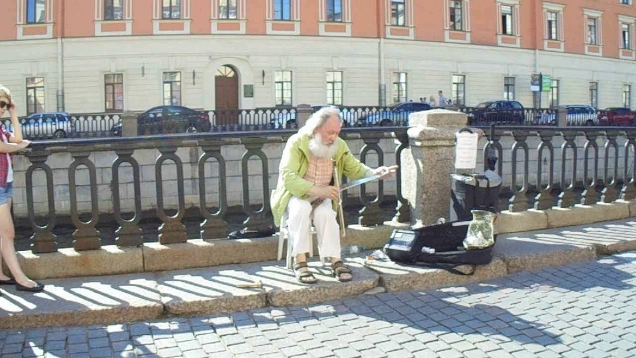Уличный музыкант играет возле Храм Спаса на Крови в Санкт-Петербурге.