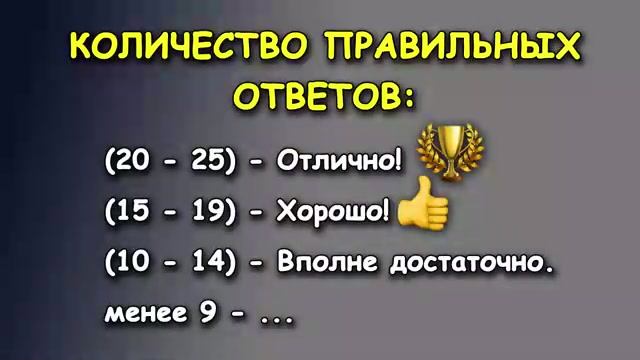 Проверь себя! Тесты. Онлайн тестирование Ответить хотя бы на 10 вопросов! Проверим, есть ли у знаний срок годности! Ваш мозг в хорошей форме? Мы подготовили 25 вопросов. Не сдавайтесь, пройдите этот тест до конца! Готовы? Тогда начинаем! 00:00 – Вступление 00:40 – Вопрос 1 – Стыд, который человек испытывает, наблюдая за поведением других людей? 01:21 – Вопрос 2 – Столица Египта? 01:49 – Вопрос 3 – Натуральный жемчуг растворяется в... 02:20 – Вопрос 4 – Цербер – это... 03:03 – Вопрос 5 – Кто автор первой матрешки? 03:40 – Вопрос 6 – Какие птицы могут распознавать человеческие лица? 04:27 – Вопрос 7 – Чем пахнет порох? 05:11 – Вопрос 8 – Кому принадлежат слова: «Я пережил много страшных вещей в своей жизни, но 99% этих событий произошли в моей голове и никогда не имели места в реальности»? 05:52 – Вопрос 9 – Автором шпионского романа, ставшего основой сериала «17 мгновений весны», является 06:40 – Вопрос 10 – Какого цвета крест на флаге Швейцарии? 07:06 – Вопрос 11 – Во сколько лет Моцарт написал свою первую оперу? 07:43 – Вопрос 12 – Кто является автором романа «Чапаев»? 08:28 – Вопрос 13 – Чей национальный танец «Сиртаки»? 09:05 – Вопрос 14 – На какое время человек смог задержать дыхание под водой, установив рекорд Гиннеса? 10:04 – Вопрос 15 – По какой таблице определяется острота зрения? 10:36 – Вопрос 16 – Шахматы. Сколько фигур у каждого игрока в начале игры? 11:04 – Вопрос 17 – Первое клонированное млекопитающее животное – овечка... 11:35 – Вопрос 18 – Мармозетка – это... 12:08 – Вопрос 19 – Любимый конь Александра Суворова? 12:36 – Вопрос 20 – Гетерохромия - это 13:15 – Вопрос 21 – Как называется денежная единица на Филиппинах? 13:43 – Вопрос 22 – Кем был написан роман «Повелитель мух»? 14:32 – Вопрос 23 – Название первого советского персонального компьютера 15:11 – Вопрос 24 – Какой цвет (в древние времена) являлся самым дорогим в мире? 15:40 – Вопрос 25 – Что означает Верона по-итальянски? 16:07 – РЕЗУЛЬТАТ 16:41 – Не забудьте поделиться своими впечатлениями в комментариях: сколько заработали баллов, какие вопросы вас удивили, что нового узнали, а что уже знали наизусть? Мы всегда рады видеть ваше активное участие. Встречаемся на следующем увлекательном квесте! #тест #тестирование #тестна #тестнавнимательность #тестнаэрудицию #тестнаобщиезнания #тестнакругозор #тестынаэрудицию #логика #тестнадеменцию #викторина #эрудиция #quiz #iq