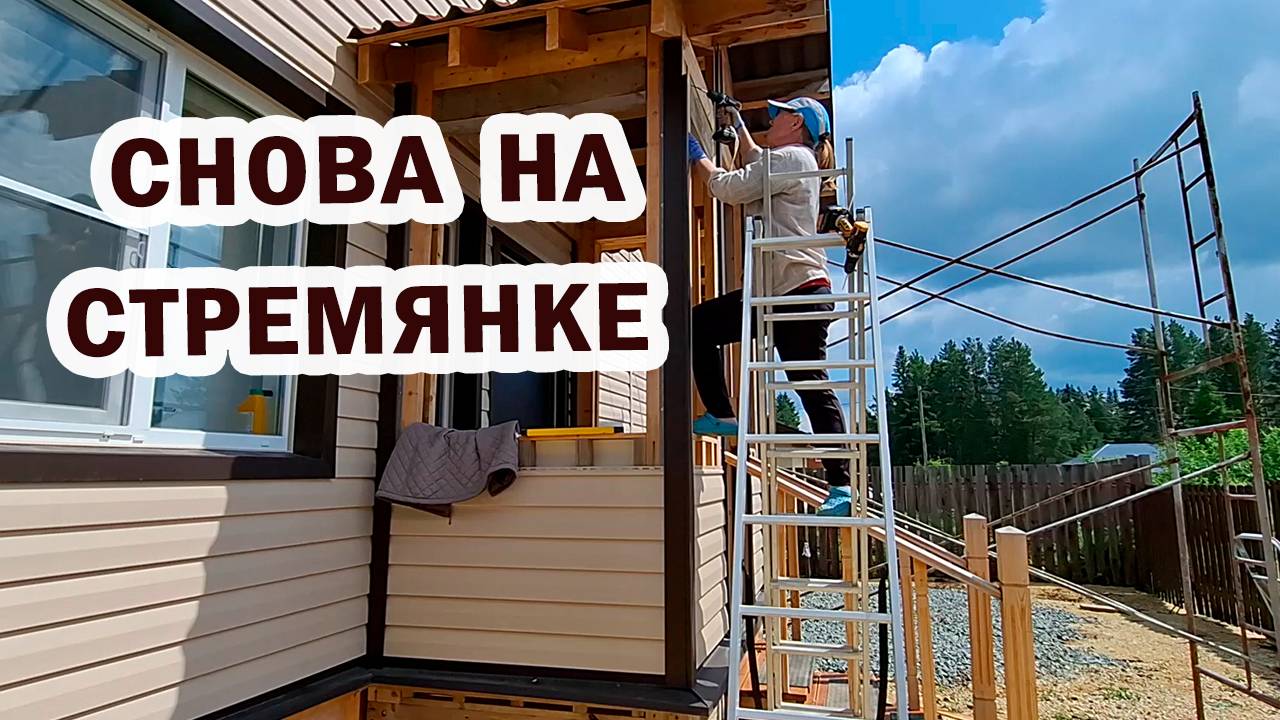 Опять на стремянке! Заканчиваю отделку крыльца. Прикручиваю доски для окон