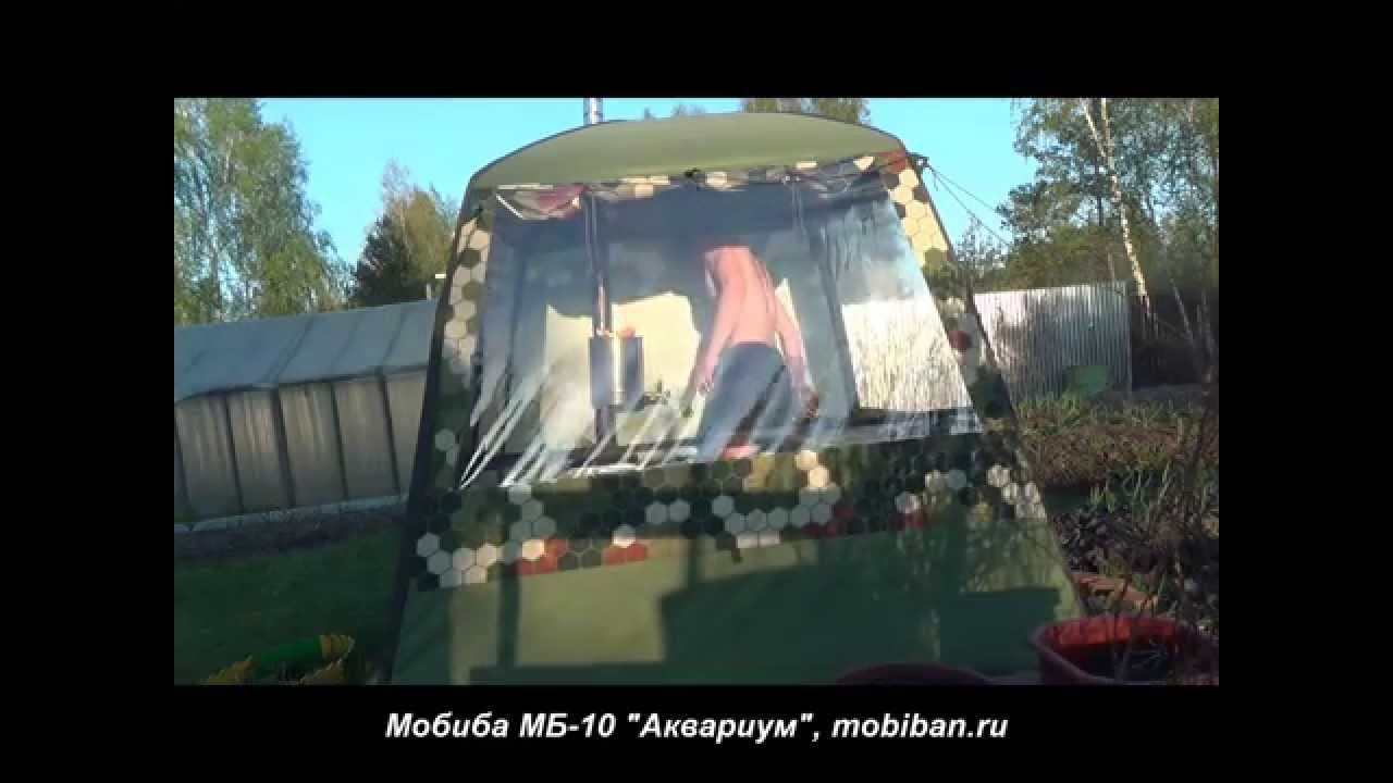 Мобильная баня Мобиба МБ-10 "Аквариум", сотовый камуфляж: http://mobiban.ru/mobiba-akvarium.php Установлена на дачном участке 6 соток. :)