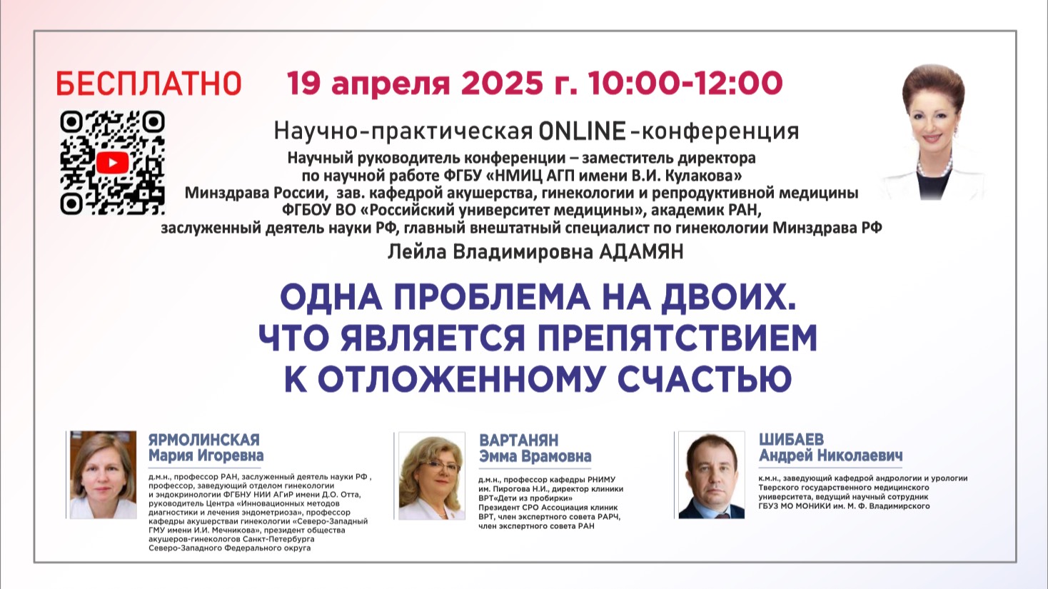 Научно-практическая конференция: ОДНА ПРОБЛЕМА НА ДВОИХ. ЧТО ЯВЛЯЕТСЯ ПРЕПЯТСТВИЕМ К ОТЛОЖЕННОМУ СЧАСТЬЮ. Проблема репродуктивного здоровья остается одной из наиболее актуальных в современном обществе. В последние десятилетия всё больше пар сталкиваются с трудностями при планировании беременности, и зачастую причиной этому становятся инфекционные заболевания. Инфекции, особенно хронические воспалительно-инфекционные процессы урогенитального тракта, оказывают значительное влияние на женскую и мужскую фертильность, становясь преградой на пути к отложенному счастью — рождению ребенка. Научно-практическая конференция «Одна проблема на двоих: что является препятствием к отложенному счастью» объединяет ведущих специалистов в области акушерства и гинекологии, урологии и репродуктологии для обсуждения роли инфекций в развитии бесплодия. Участники мероприятия рассмотрят широкий спектр вопросов, связанных с влиянием воспалительных процессов на репродуктивную функцию, а также обсудят практические аспекты планирования позднего материнства. Научный руководитель конференции: АДАМЯН Лейла Владимировна Заместитель директора ФГБУ «НМИЦ акушерства, гинекологии и перинатологии имени В.И. Кулакова» Минздрава России, зав. кафедрой репродуктивной медицины и хирургии ФГБОУ ВО «Российский университет медицины», академик РАН, заслуженный деятель науки РФ, главный внештатный специалист по гинекологии Минздрава РФ Спикеры: ЯРМОЛИНСКАЯ Мария Игоревна – профессор РАН, д.м.н., профессор, заведующая отделом гинекологии и эндокринологии ФГБНУ «НИИ АГ и Р им. Д.О. Отта», профессор кафедры акушерства и гинекологии СЗГМУ им. И.И. Мечникова, Президент общества акушеров-гинекологов Санкт-Петербурга и СЗФО, г. Санкт-Петербург ВАРТАНЯН Эмма Врамовна – д.м.н., профессор кафедры РНИМУ им Пирогова Н.И., директор клиники ВРТ «Дети из пробирки», президент СРО Ассоциация клиник ВРТ, член Экспертного совета РАРЧ, член экспертного совета РАН Мужское долголетие. ШИБАЕВ Андрей Николаевич – Зав. кафедрой андрологии и урологии Тверского государственного медицинского университета. Ведущий научный сотрудник ГБУЗ МО МОНИКИ им. М. Ф. Владимирского Программа конференции: 1) "ИНФЕКЦИЯ И ФЕРТИЛЬНОСТЬ: КАК ВОСПАЛЕНИЕ СНИЖАЕТ ШАНСЫ НА УСПЕШНОЕ ЗАЧАТИЕ" ( ЯРМОЛИНСКАЯ Мария Игоревна ) 2) "МАТЕРИНСТВО НА ПАУЗЕ: РАЗМЫШЛЕНИЯ И ОПЫТ" ( ВАРТАНЯН Эмма Врамовна ) 3) "СКРЫТАЯ УГРОЗА МУЖСКОЙ ФЕРТИЛЬНОСТИ" ( ШИБАЕВ Андрей Николаевич ) «Дискуссия. Ответы на вопросы» Адамян Л.В., Ярмолинская М.И., Вартанян Э.В., Шибаев А.Н.