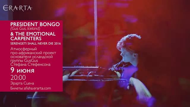 9 июня 2016 г. President Bongo (GusGus) и The Emotional Carpenters выступят на Эрарта Сцене в рамках тура Serengeti Shall Never Die 2016. Подробности и билеты онлайн http://www.erarta.com/ru/calendar/events/detail/bda7811c-0c5a-11e6-ad4a-8920284aa333/