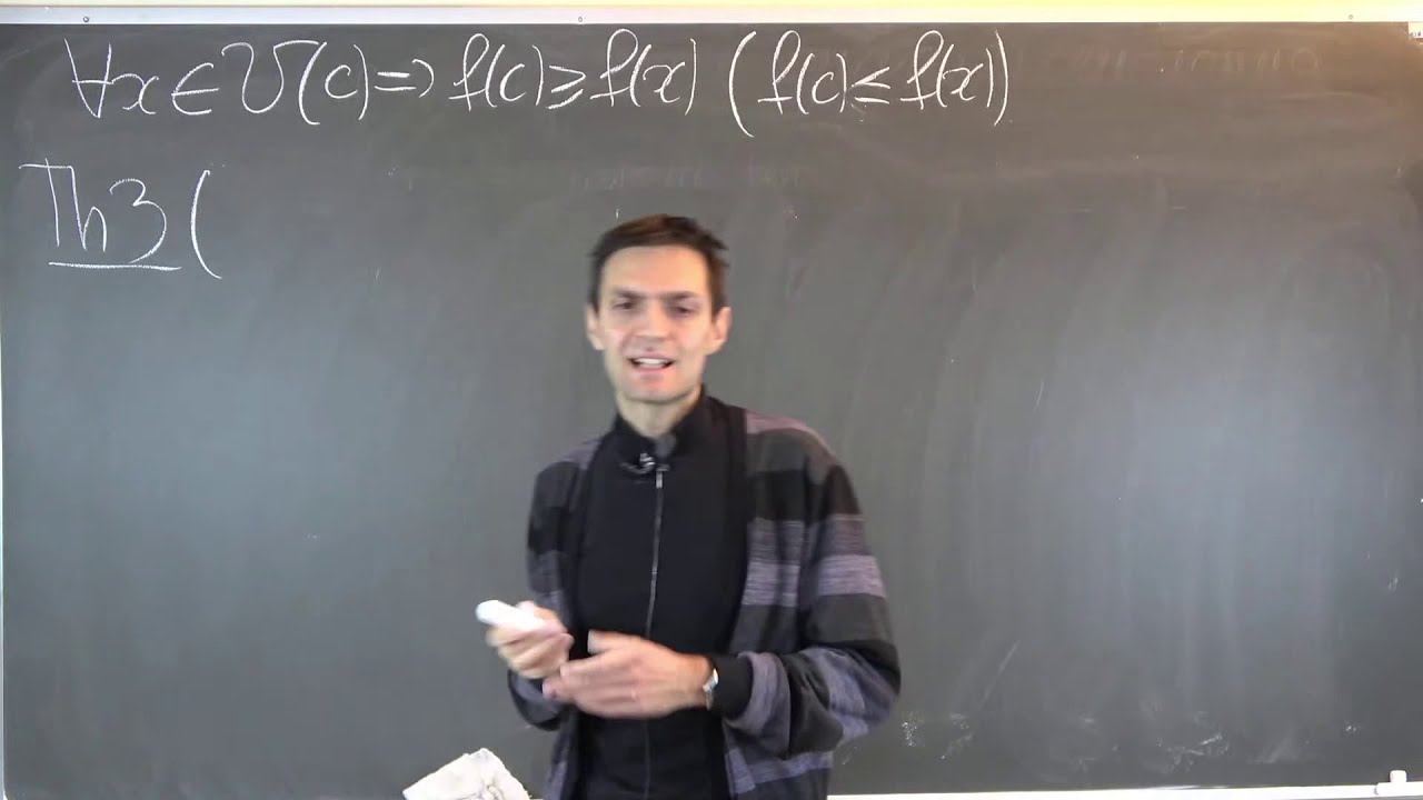 00:00 – Вводное слово 1:20 - Ввод в тему - Основные теоремы дифференциального исчисления 2:40 - Определение возрастающей(убывающей) функции в точке 6:55 - Определение локального максимума (минимума) 9:20 - Определение локального экстремума 13:10 - Теорема 3 (достаточные условия возрастания / убывания функции в точке) + доказательство 24:03 - Замечание к теореме 3 +пример 27:24 - Теорема Ферма или необходимое условие локального экстремума + доказательство 33:00 - Замечание 1 к теореме Ферма 34:20 - Замечание 2 к теореме Ферма 38:20 - Теорема Дарбу + доказательство 1:00:00 - Замечание 1 к теореме Дарбу 1:01:25 - Пример 1:03:43 - Замечание 2 к теореме Дарбу 1:06:17 - Теорема Ролля + доказательство 1:21:17 - Теорема Лагранжа + доказательство 1:27:53 - Блок-схема всех тем первого курса по Мат.анализу 1:29:42 - Определение не возрастающей (не убывающей) функции на интервале 1:31:25 - Следствие 1 (признак монотонности функции) 1:36:20 - Следствие 2 (критерий монотонности функции) 1:39:27 - Следствие 3