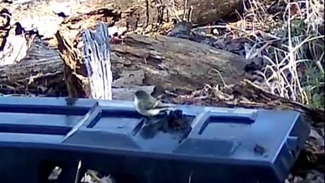 Eastern Phoebe foraging on insects near scat pile on plastic latrine (debris)