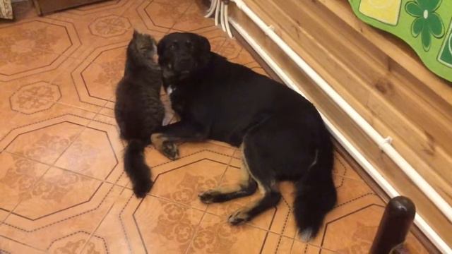 кот вылизывает собаку