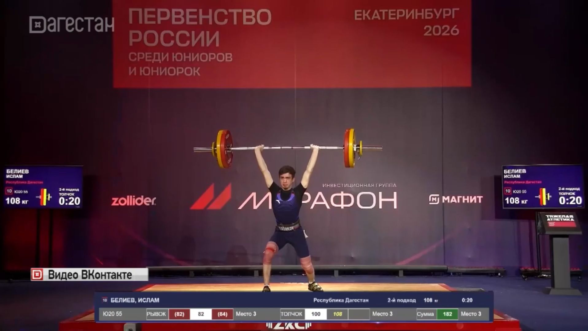 В Екатеринбурге проходит юниорское первенство России по тяжелой атлетике. В стартовый день турнира, в весе до 55 кг, бронзовую медаль выиграл Ислам Белиев. Его показатели: Рывок 82 кг, толчок 100 кг. В сумме двоеборья, дагестанец набрал 182 кг, и вошел в тройку лучших юниоров страны.