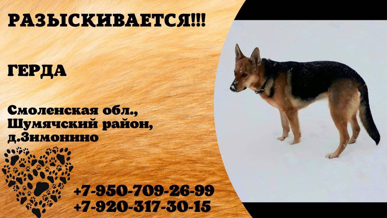 Смоленская д.Зимонино Пропала собака 4 ноября 2024 года во второй половине дня пропал любимый друг и член семьи, девочка, зовут Герда, 6 лет. Жила в частном доме деревни Зимонино. Герда просто «провалилась под землю». Вышла из дома и исчезла... Предположительно побежала за охотничьей собакой в лес. Собака с ошейником! Она очень добрая, хоть и большая. Может находиться в соседних деревнях или в соседних районах. Обратите внимание, быть может, в вашем дворе появилась у кого-то из соседей наша собака. Любая информация бесценна! Если вам удастся сфотографировать увиденную собаку, это ускорило бы поиски!!! Кто знает о её местонахождении или видел, или "приютил" - просьба позвонить! Она очень любима и дорога! Помогите найти любимицу семьи! Очень скучаем по нашей девочке(( За возврат собаки гарантируем денежное вознаграждение! Тел. 8(950)7092699, 8(920)3173015 Заранее Большое Спасибо!!! Инфо: https://vk.com/wall-198815410_159863