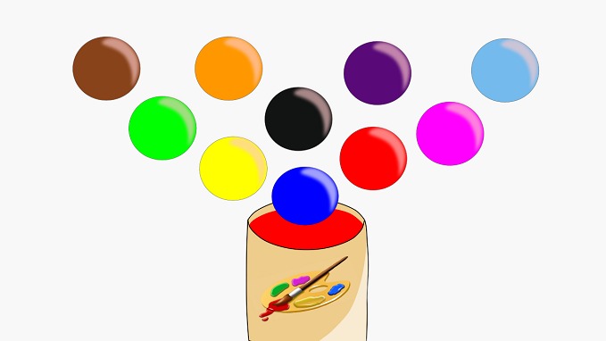 Сегодня дети выучат цвета. Мячик падает в ведра с краской и окрашивается в разные цвета. Цель видео: