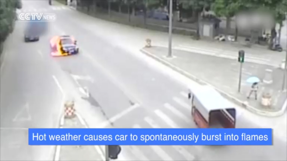 Из-за горячей и жаркой погоды в Китае автомобиль загорелся прямо на дороге.