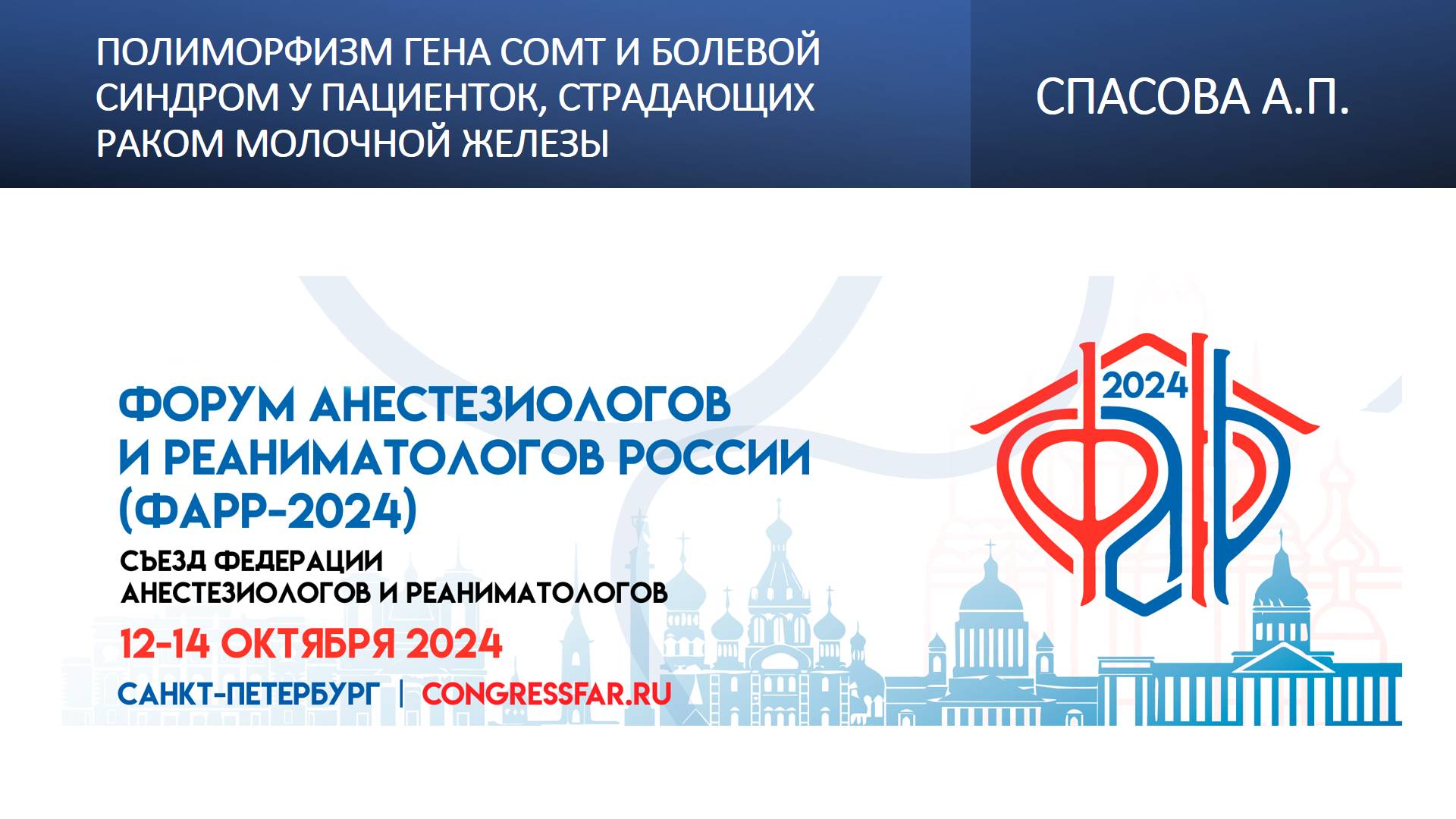 Видеозапись ФАРР-2024, XXII съезд Федерации анестезиологов и реаниматологов 12-14 октября 2024, Санкт-Петербург. Арина Павловна Спасова "Полиморфизм гена СОМТ и болевой синдром у пациенток, страдающих раком молочной железы" Информация, размещенная на канале, предназначена исключительно для медицинских специалистов