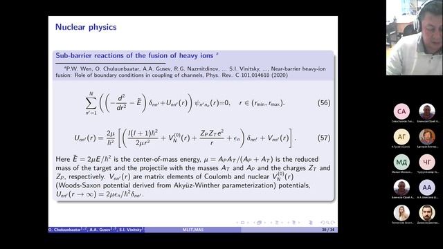 https://events.rudn.ru/event/183/ Обновления программы KANTBP и их применение для решения некоторых физических проблем О. Чулуунбаатар Монгольская академия наук, Улан-Батор, 13330, Монголия в сотрудничестве с А.А. Гусев, С.И. Виницкий Объединенный институт ядерных исследований, Дубна, Московская область, 141980, Россия Государственный университет «Дубна», Дубна, Московская область, 141980, Россия Российский университет дружбы народов (РУДН), 117198 Москва, Россия Первая FORTRAN версия программы KANTBP для вычисления значений энергии, матриц отражения и прохождения (или матрицы реакции) и соответствующих волновых функций в приближении связанных каналов адиабатического подхода была опубликована в Computer Physics Communications в 2007 году. При таком подходе многомерное уравнение Шредингера сводится к системе связанных обыкновенных дифференциальных уравнений второго порядка на конечном интервале с однородными краевыми условиями третьего рода в левой и правой граничных точках для задач дискретного спектра и многоканального рассеяния. Соответствующие краевые задачи решаются методом конечных элементов с использованием аппроксимаций высокого порядка точности. В течение 15 лет программа KANTBP обновлялась в трех FORTRAN версиях и двух MAPLE версиях. Эти версии применялись и применяются для решения различных задач в атомной, молекулярной и ядерной физике. Updates to the KANTBP program and their applications to solve some physical problems O. Chuluunbaatar Mongolian Academy of Sciences, Ulaanbaatar, 13330, Mongolia in collaboration with A.A. Gusev, S.I. Vinitsky Joint Institute for Nuclear Research, Dubna, Moscow Region, 141980, Russia Dubna State University, Dubna, Moscow Region, 141980, Russia Peoples' Friendship University of Russia (RUDN University), 117198 Moscow, Russia The first FORTRAN version of the KANTBP program to calculate the energy values, reflection and transmission matrices (or reaction matrix) and the corresponding wave functions in the coupled channel approximation of the adiabatic approach was published in Computer Physics Communications in 2007. In this approach, the multidimensional Schrödinger equation is reduced to a system of coupled second-order ordinary differential equations on a finite interval with the homogeneous boundary conditions of the third type at the left- and right-boundary points for discrete spectrum and multichannel scattering problems. The corresponding boundary-value problems are solved by the finite element method using high-order accuracy approximations. Within 15 years, the KANTBP program has been updated in three FORTRAN versions and two MAPLE versions. The versions have been and are applied to solve various problems in atomic, molecular and nuclear physics. Ссылки на программы – Links to programs: KANTBP 1.0 – http://elsevier.digitalcommonsdata.com/datasets/2gcb9tjknz/1 KANTBP 2.0 – https://elsevier.digitalcommonsdata.com/datasets/stxc75v54w/1 KANTBP 3.0 – https://elsevier.digitalcommonsdata.com/datasets/7rdv5h3tns/1 KANTBP 3.1 – https://data.mendeley.com/datasets/4vm9fhyvh3/1 KANTBP 4M – http://wwwinfo.jinr.ru/programs/jinrlib/kantbp4m/indexe.html KANTBP 5M – https://link.springer.com/chapter/10.1007/978-3-030-81698-8_11