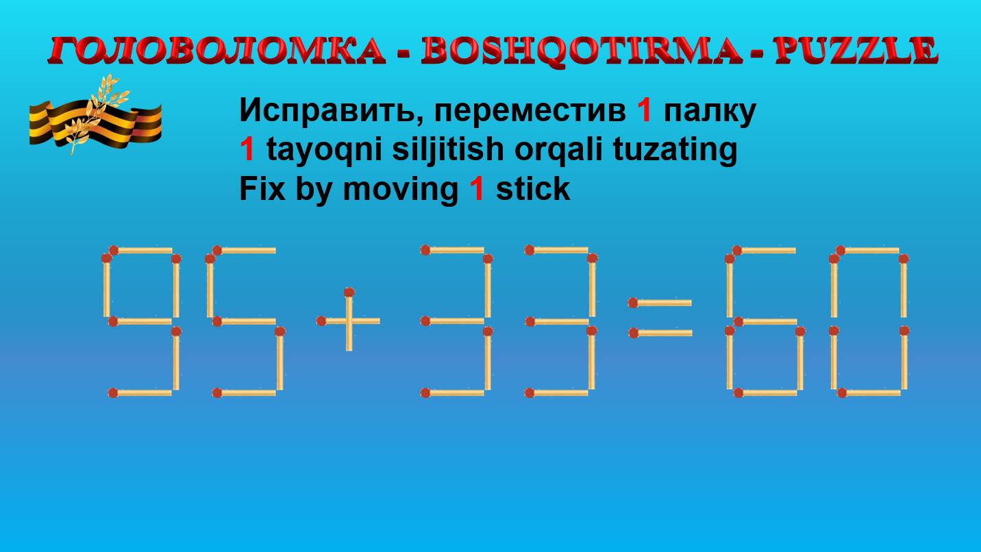 ГОЛОВОЛОМКА - BOSHQOTIRMA – PUZZLE. Спичка. 95+33=60, 50-39=23, 93-29=62, 83+25=50 https://t.me/RUTUBEMATEMATIK